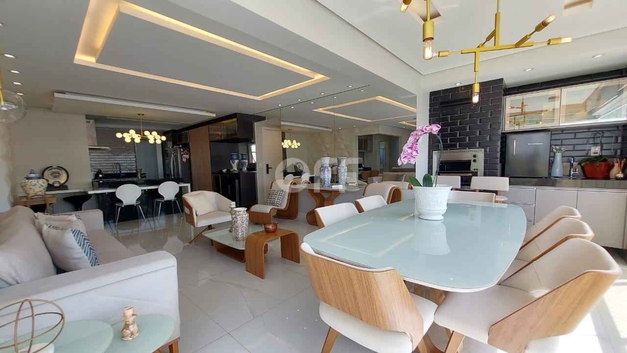 Sala de estar e jantar integradas à varanda gourmet com churrasqueira