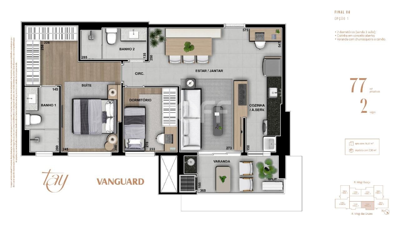 77 m² | 2 dormitórios (1 suíte) | 2 banheiros