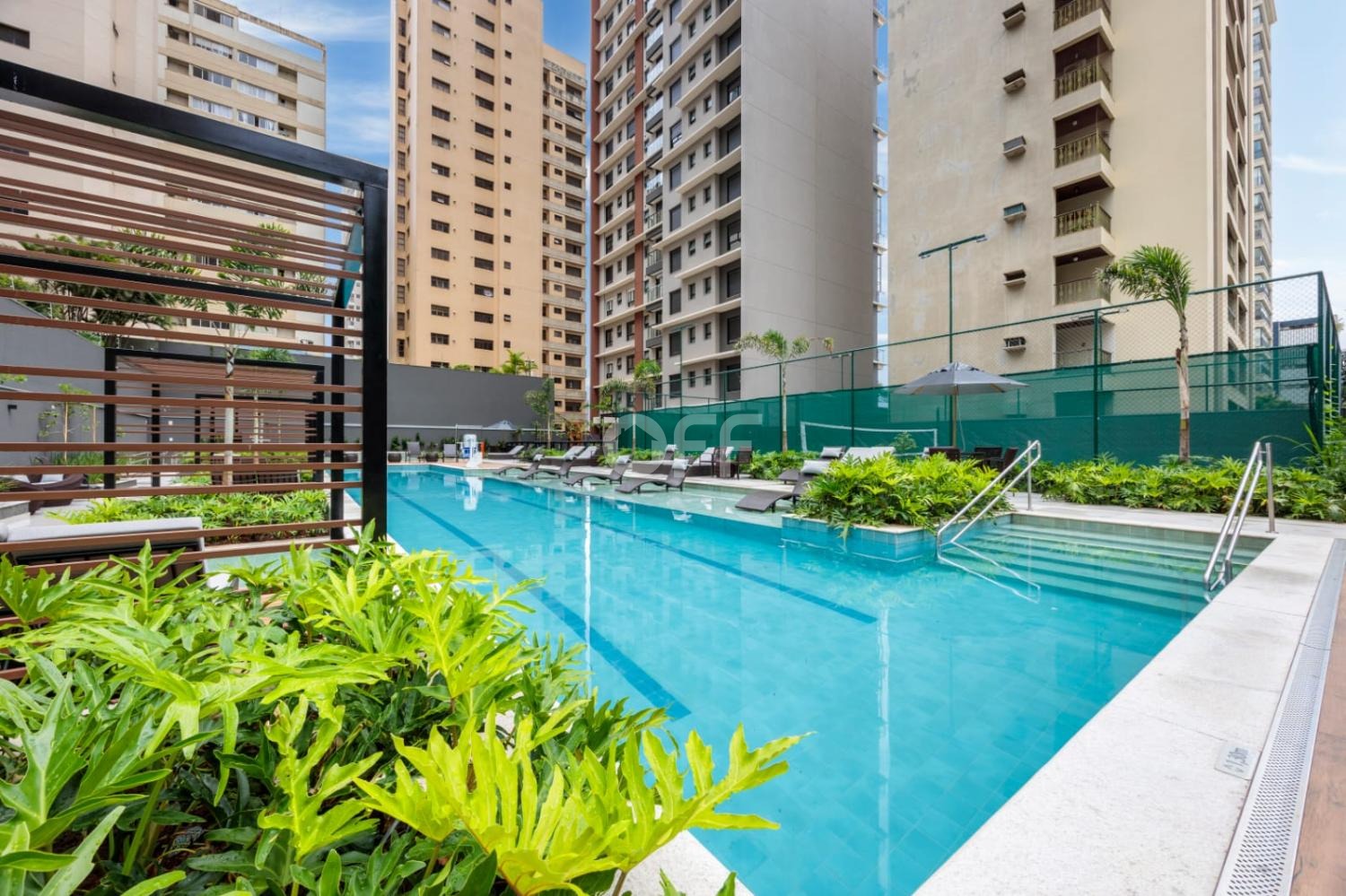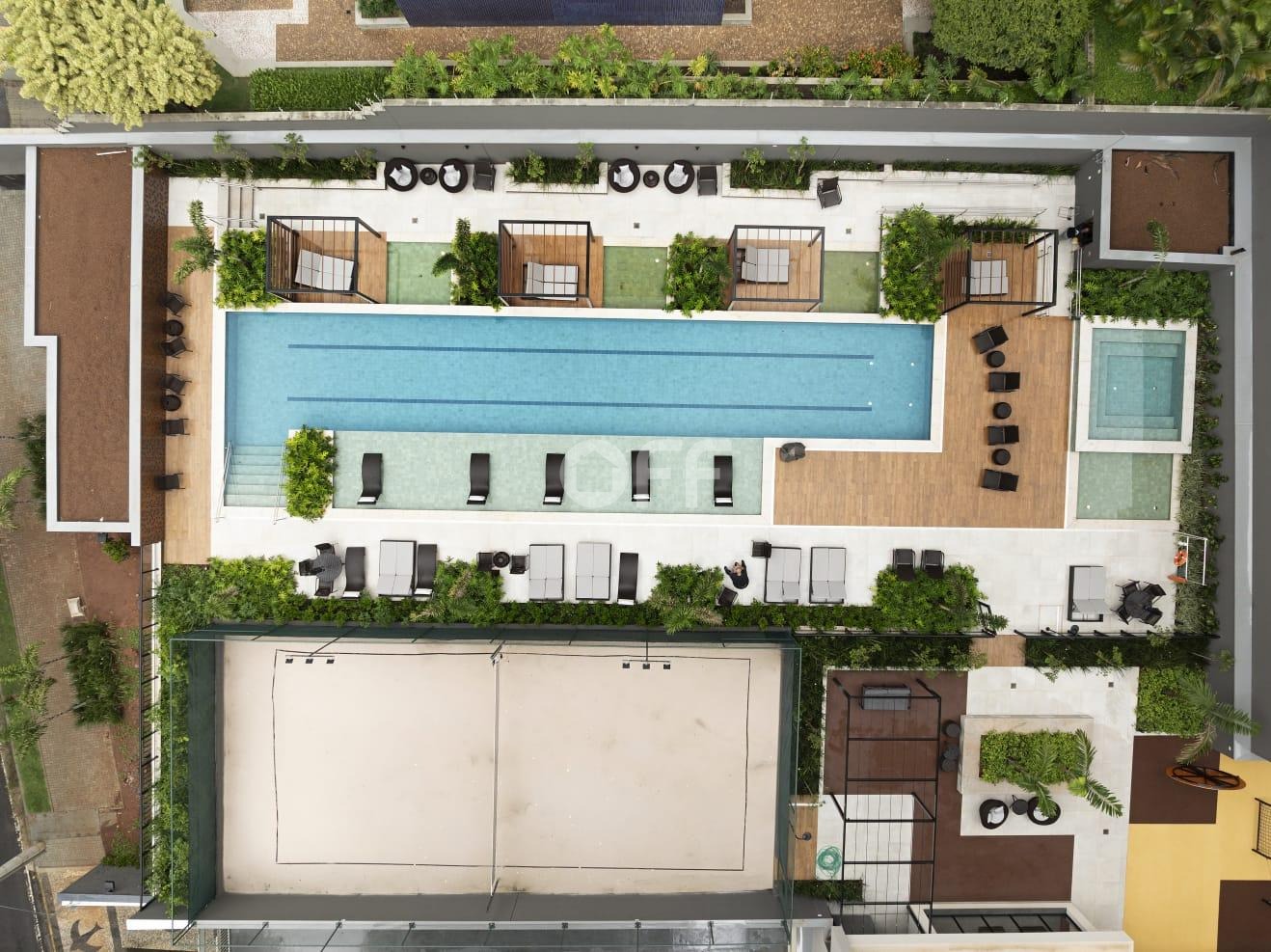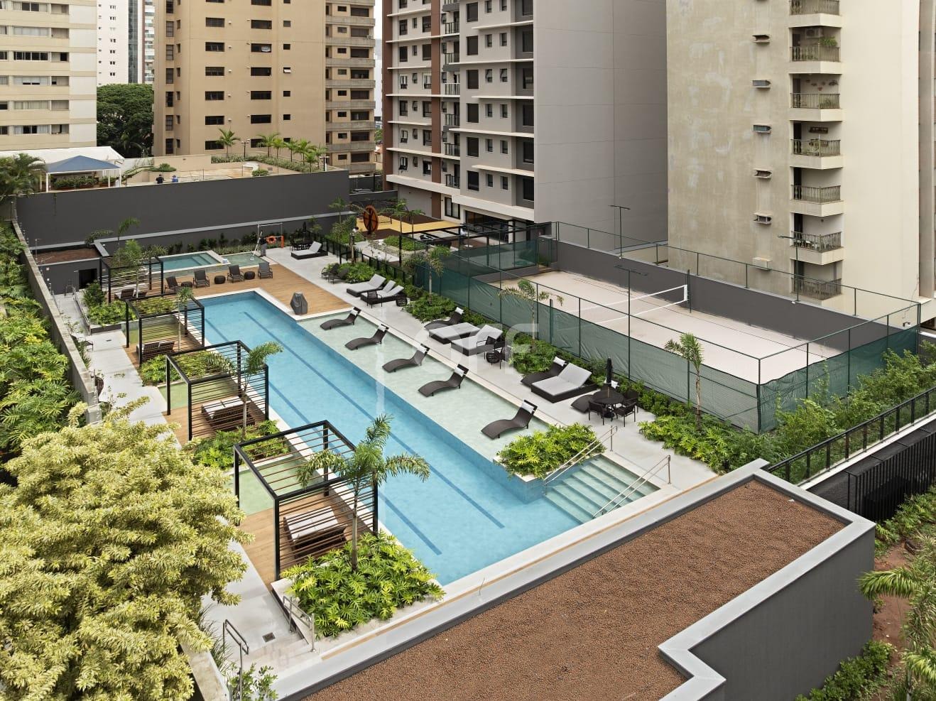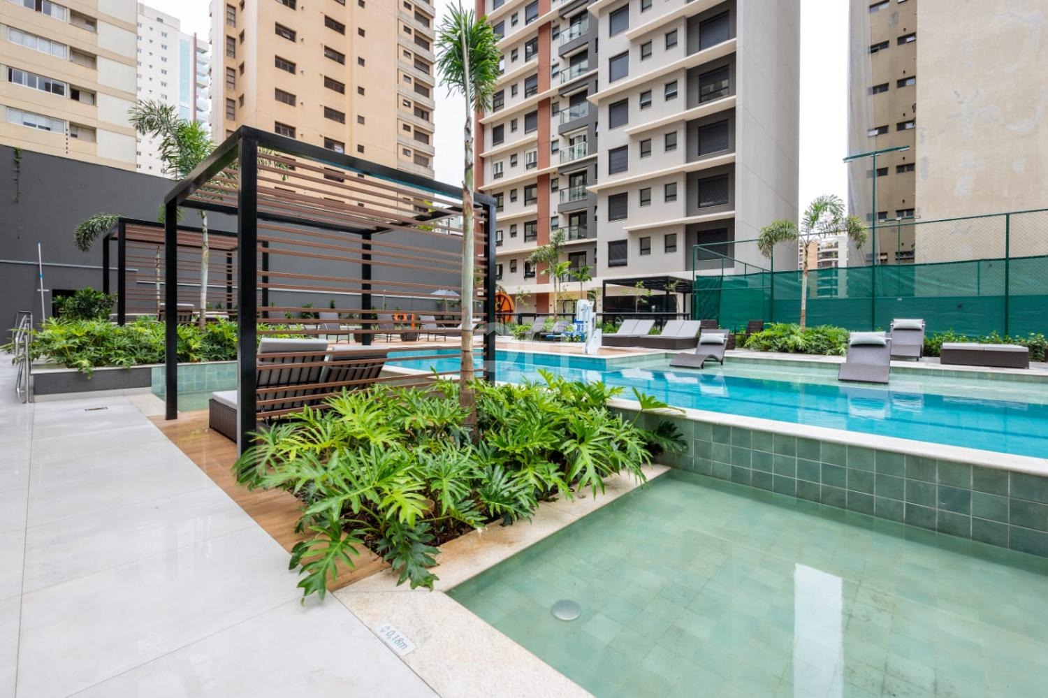 Piscina com prainha, solarium e gazebos privativos