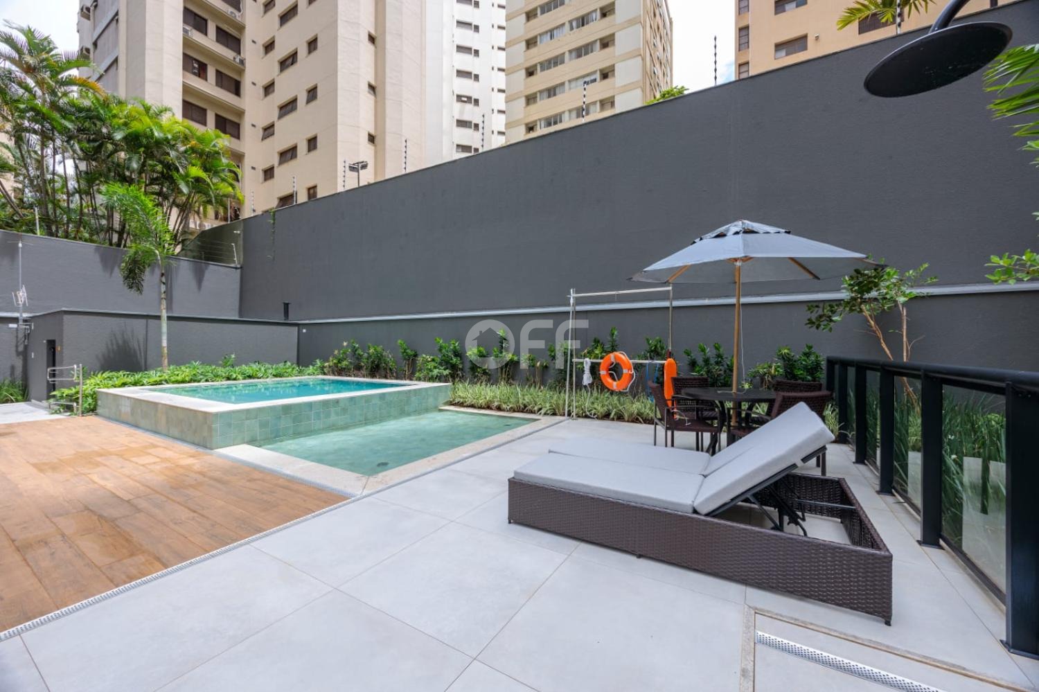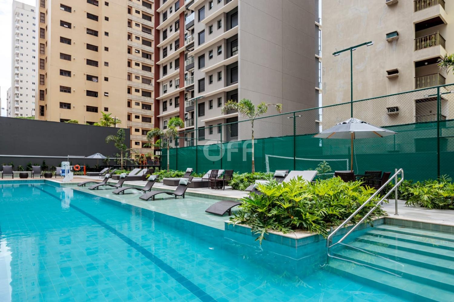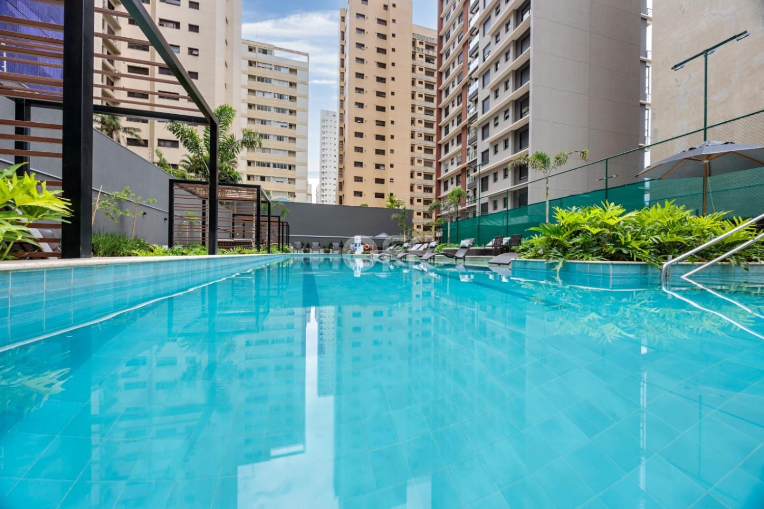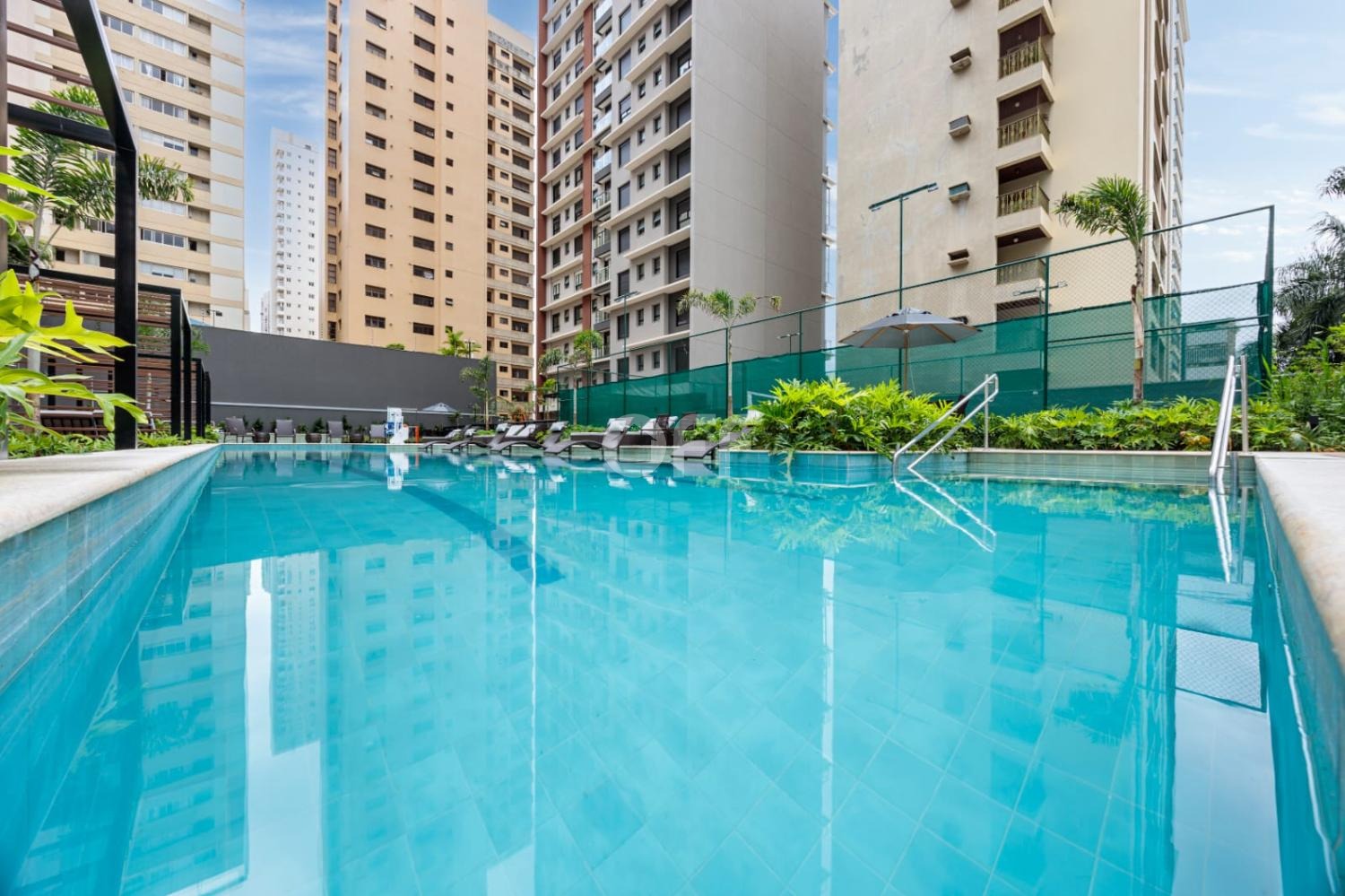 Piscina com prainha, solarium e gazebos privativos