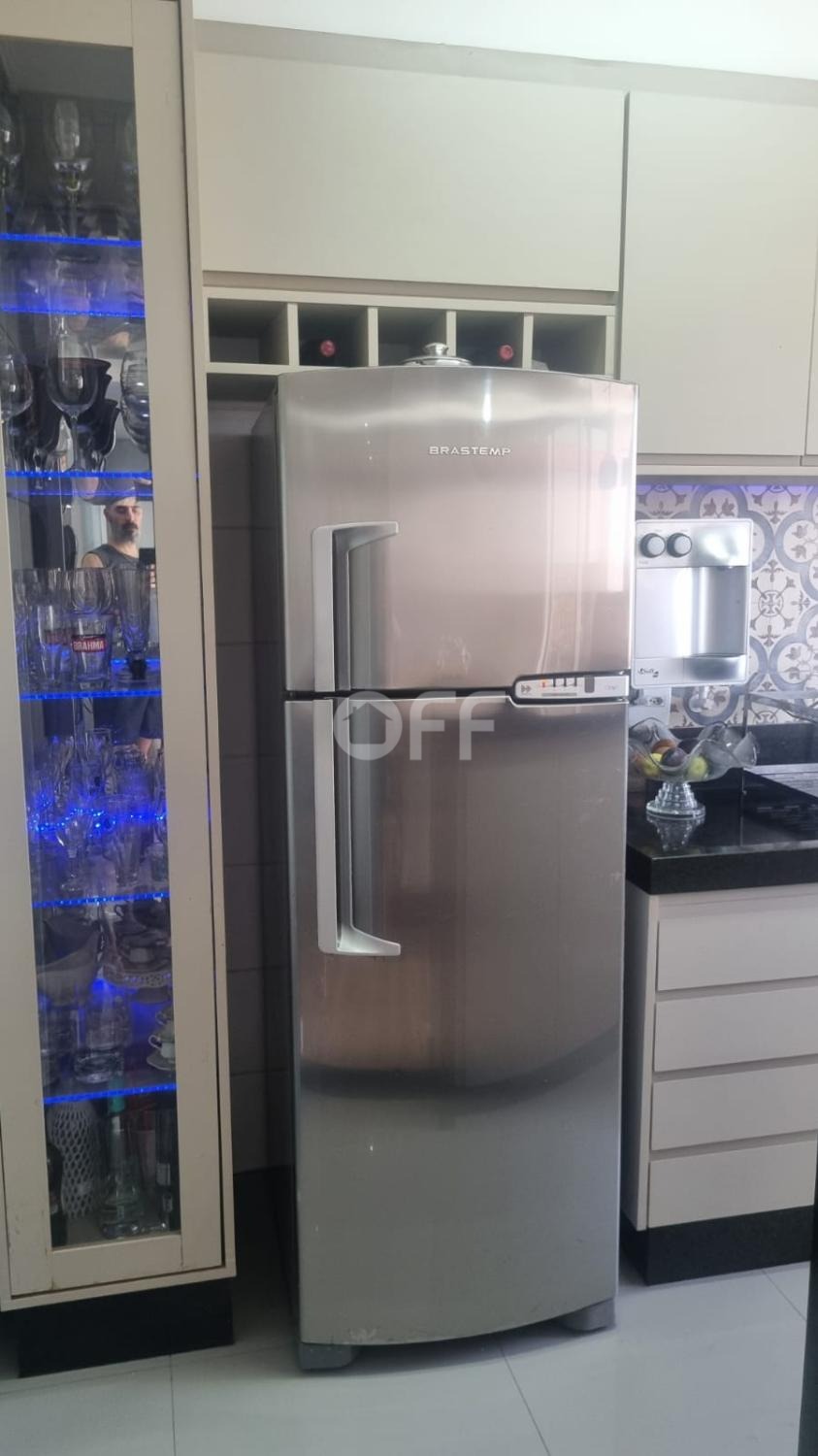 A cozinha americana com balcão é rica em armários planejados e equipada com forno elétrico embutido, cooktop, coifa e cristaleira com iluminação em LED, garantindo praticidade e sofisticação no dia a dia.