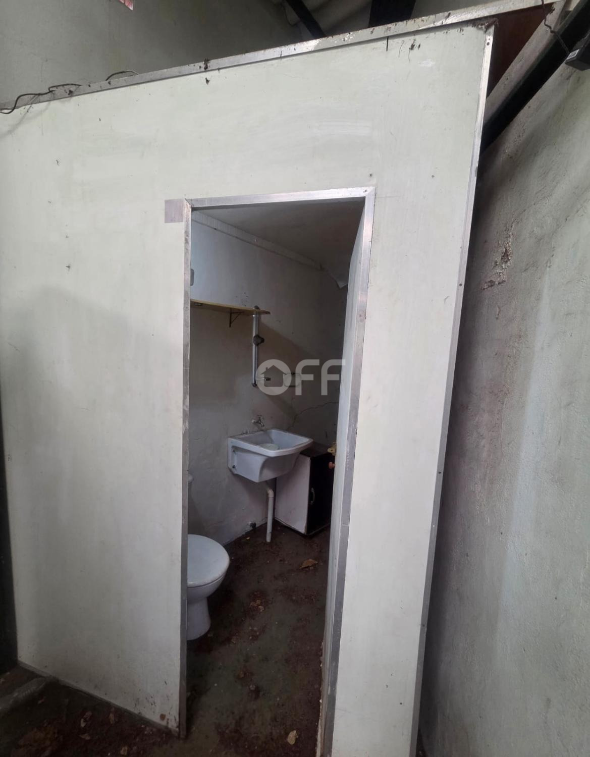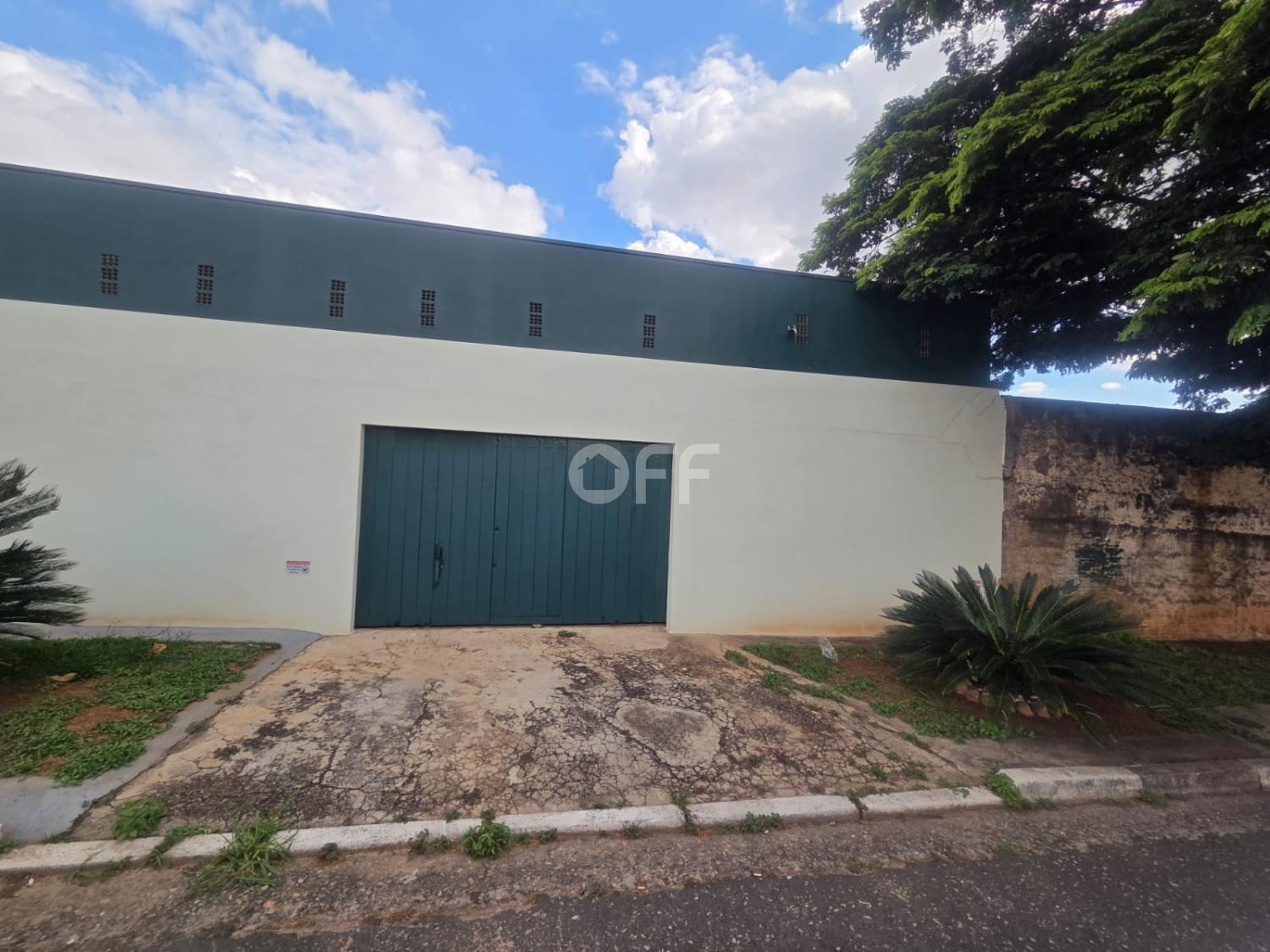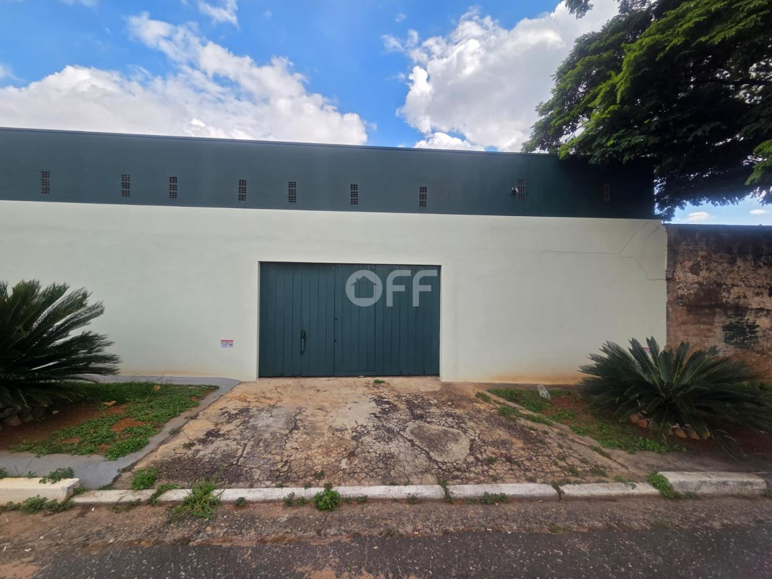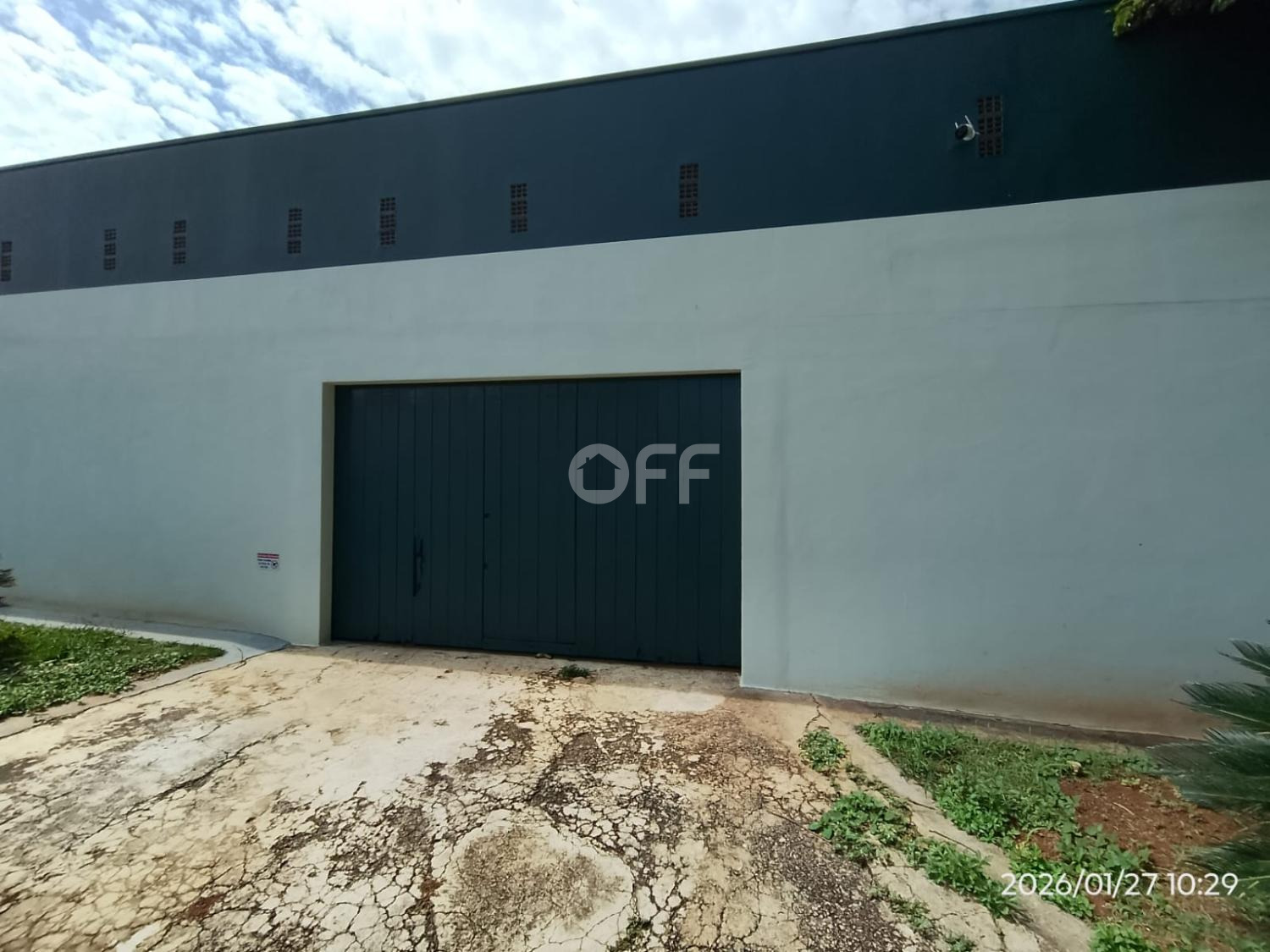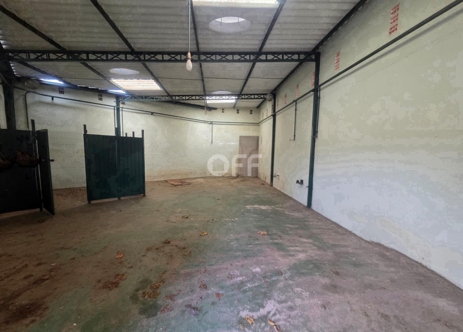 Portão fechado a frente do barracão com espaço para duas vagas.