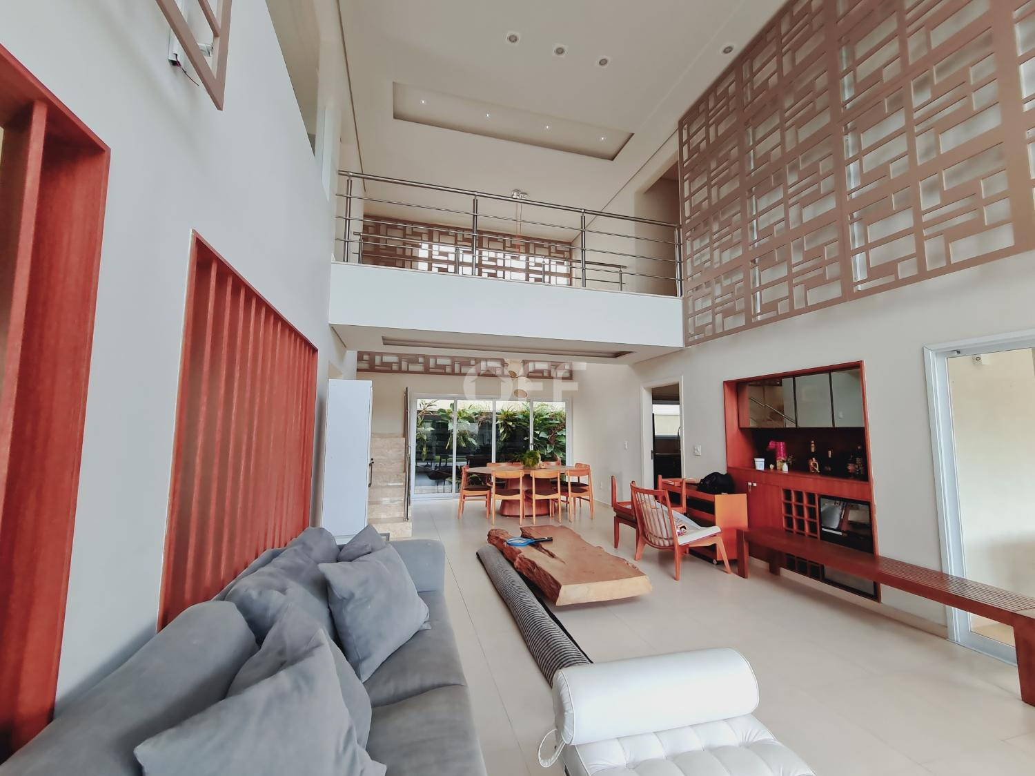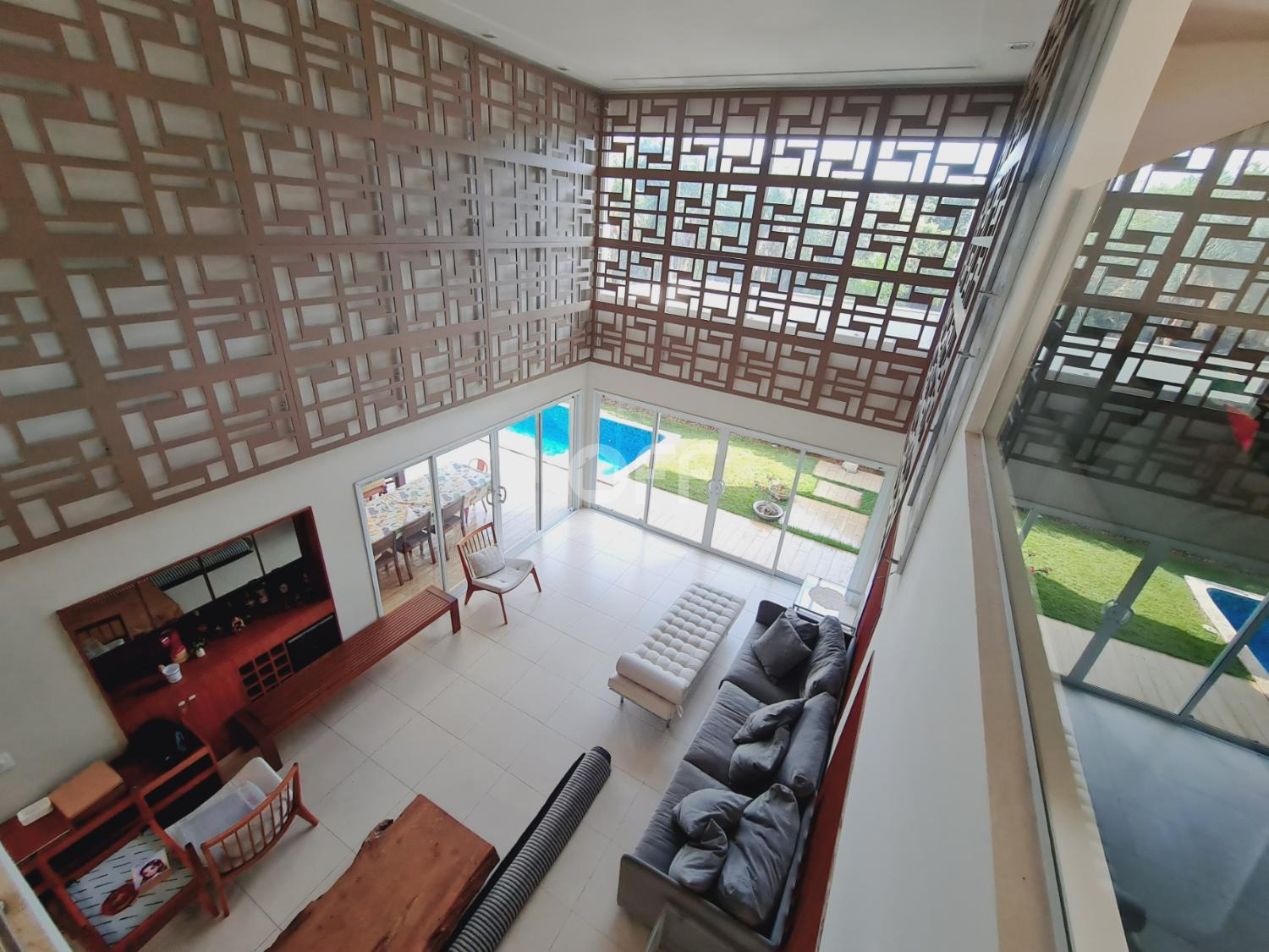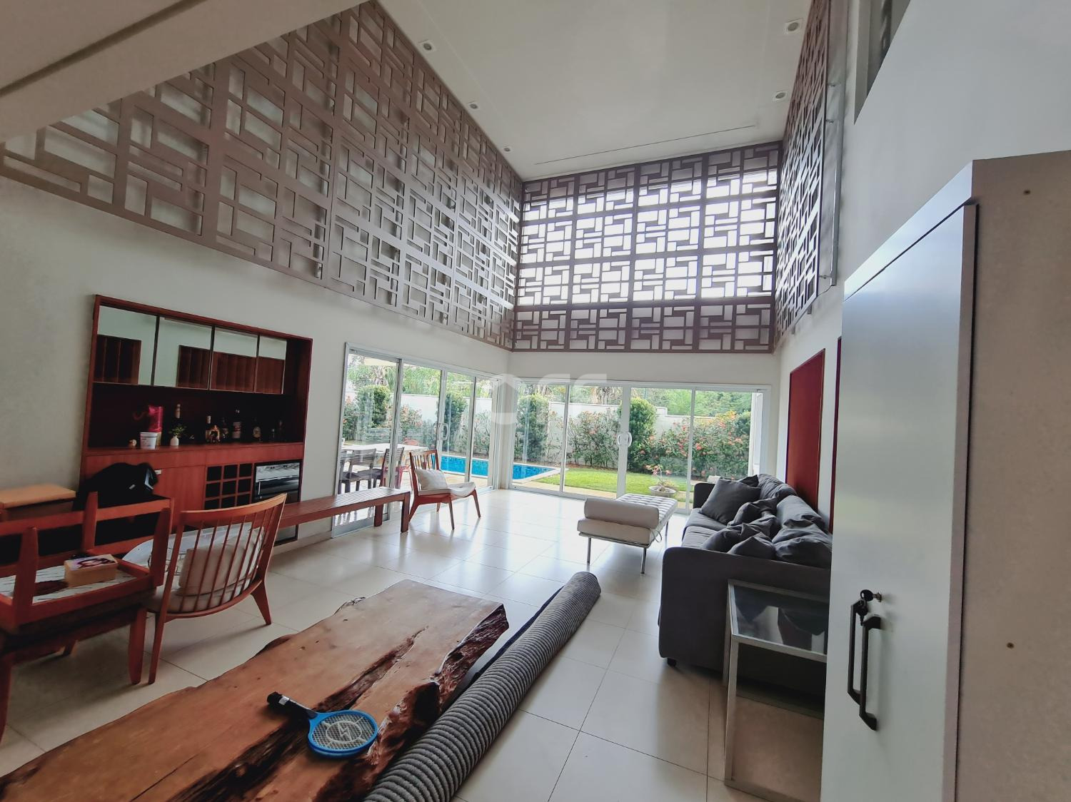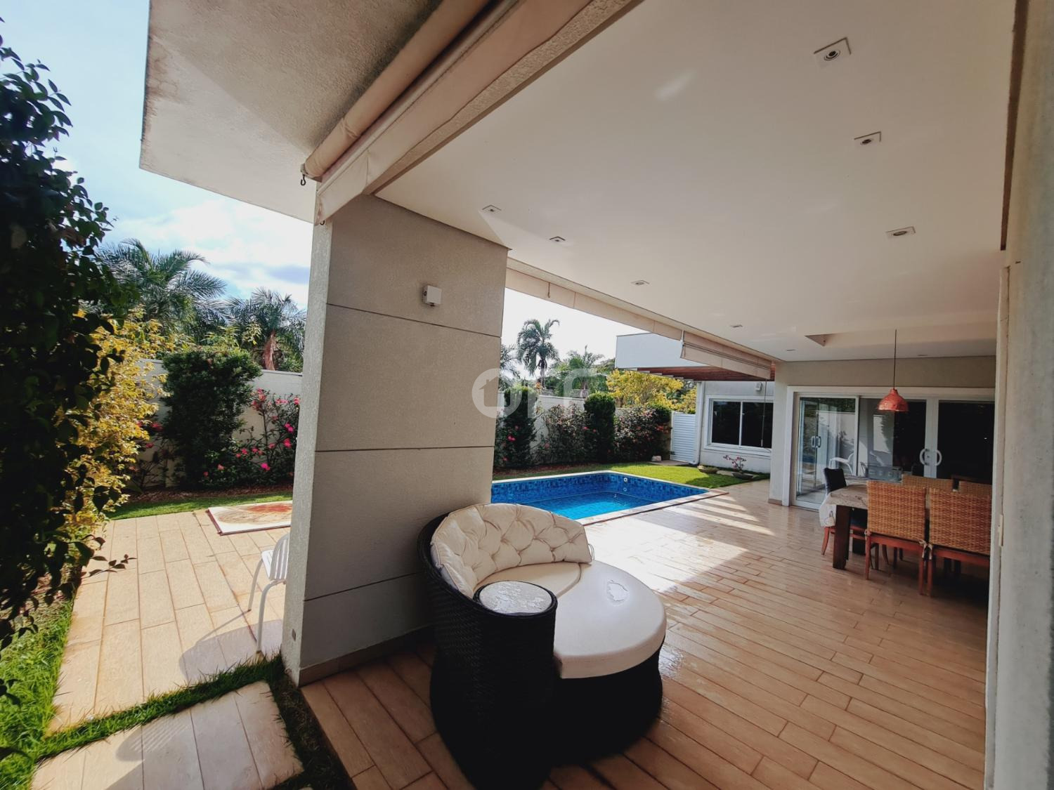 A residência conta com isolamento lateral, com ambientes amplos e integrados, como sala de estar, sala de jantar, sala de cinema com varanda com vista para a piscina.