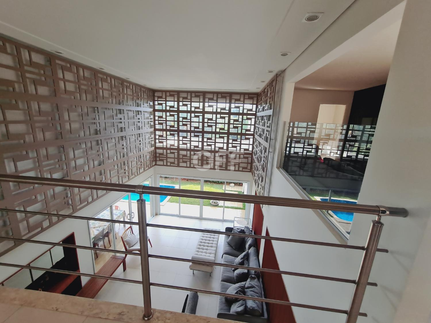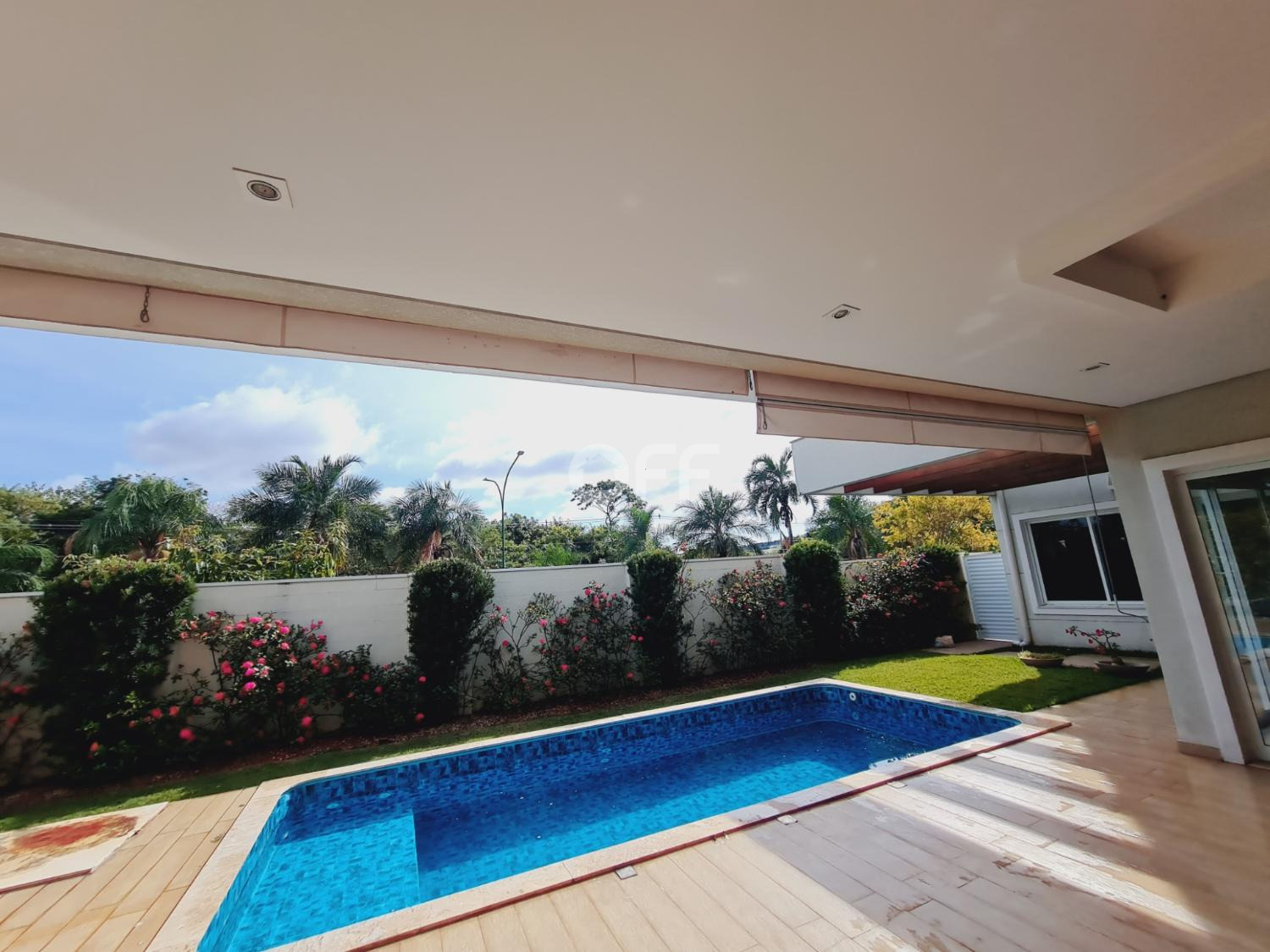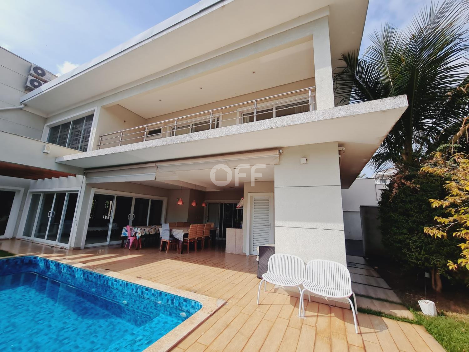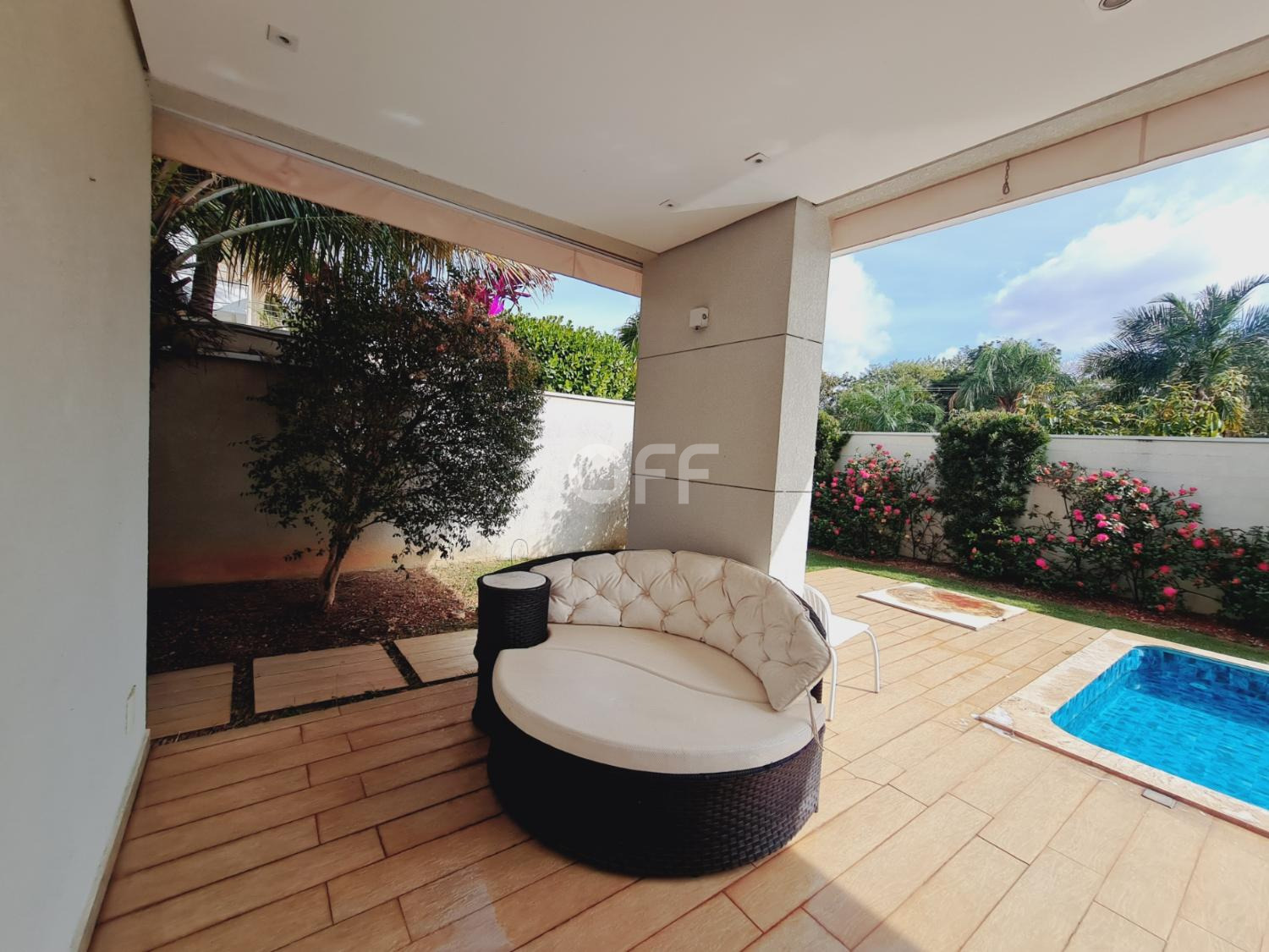 A residência conta com isolamento lateral, com ambientes amplos e integrados, como sala de estar, sala de jantar, sala de cinema com varanda com vista para a piscina.