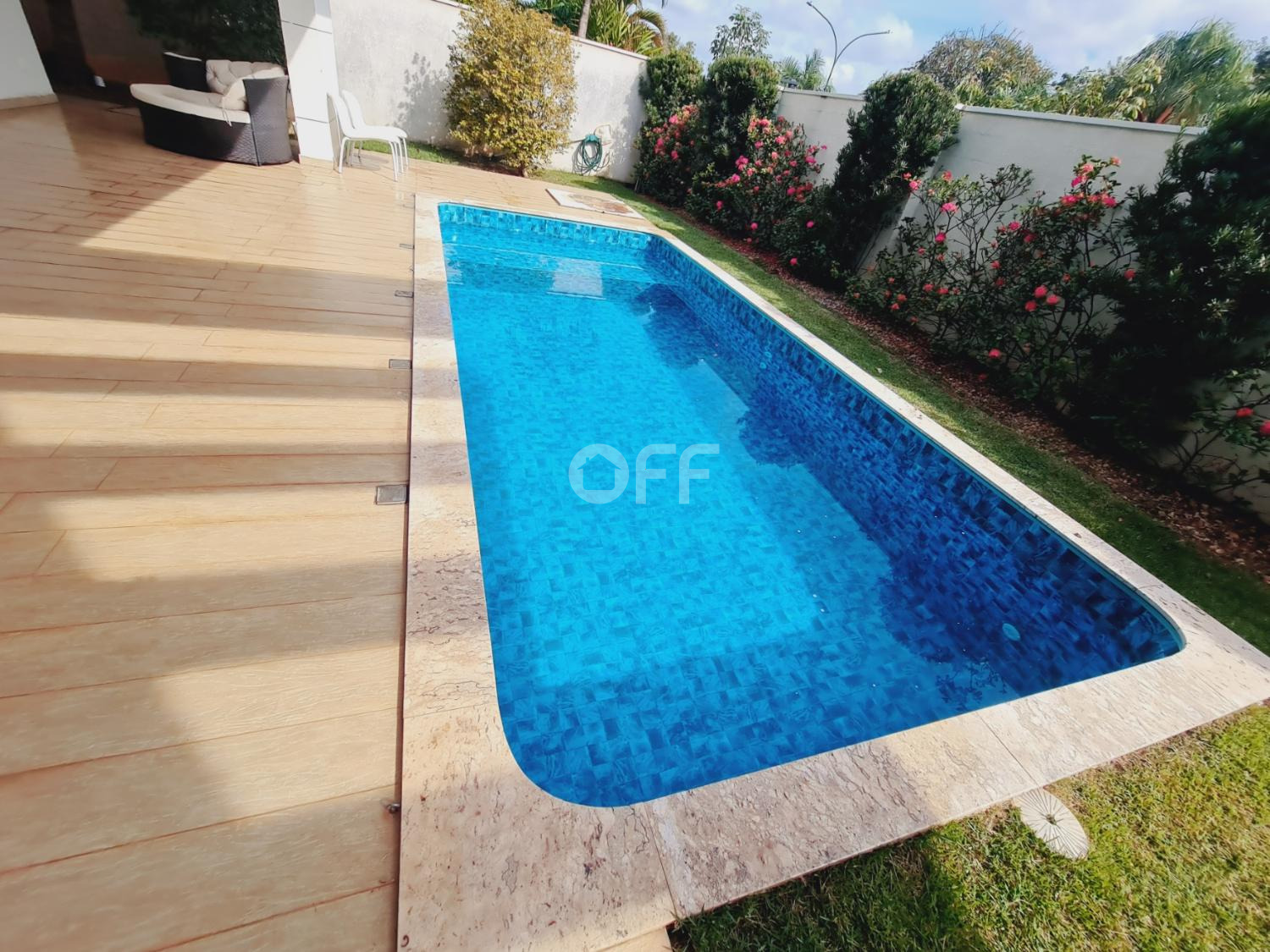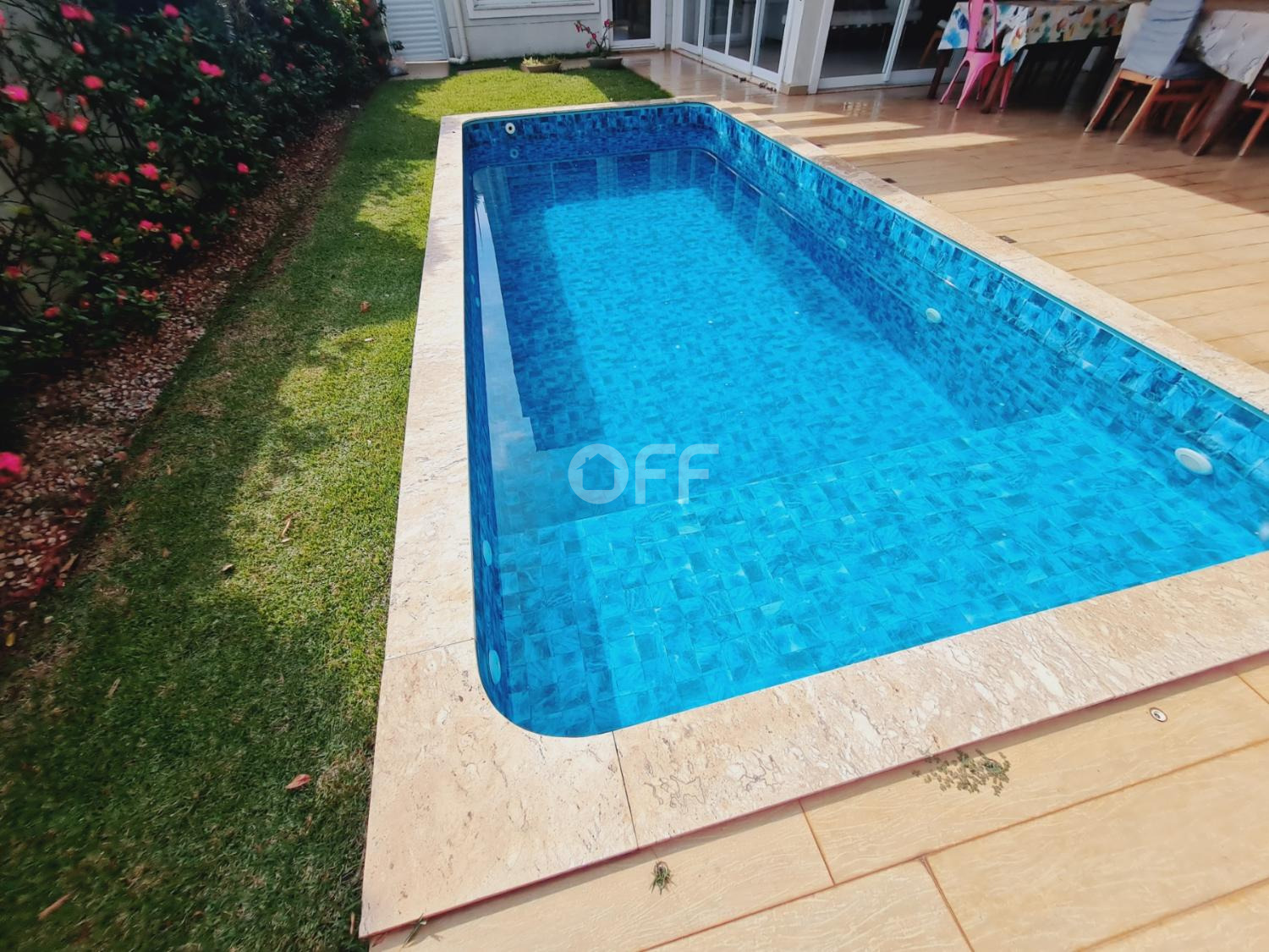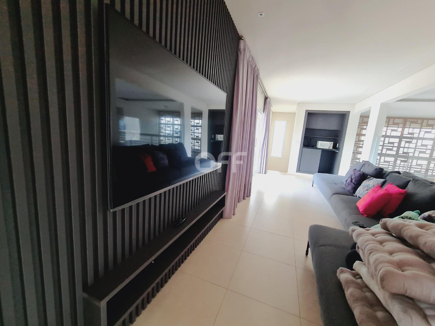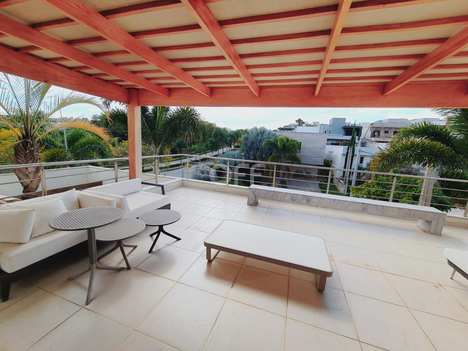 A residência conta com isolamento lateral, com ambientes amplos e integrados, como sala de estar, sala de jantar, sala de cinema com varanda com vista para a piscina.