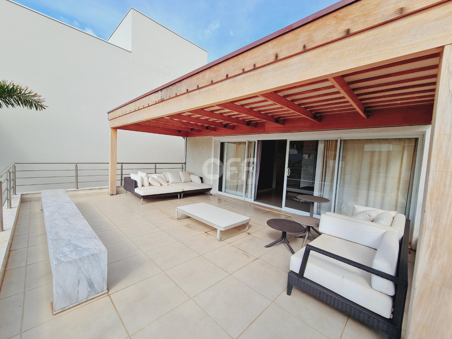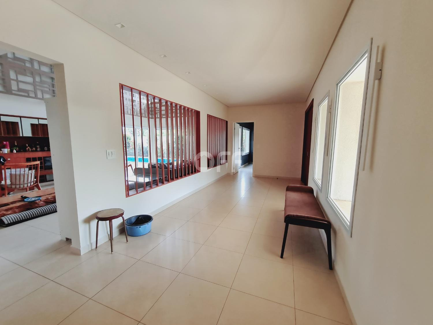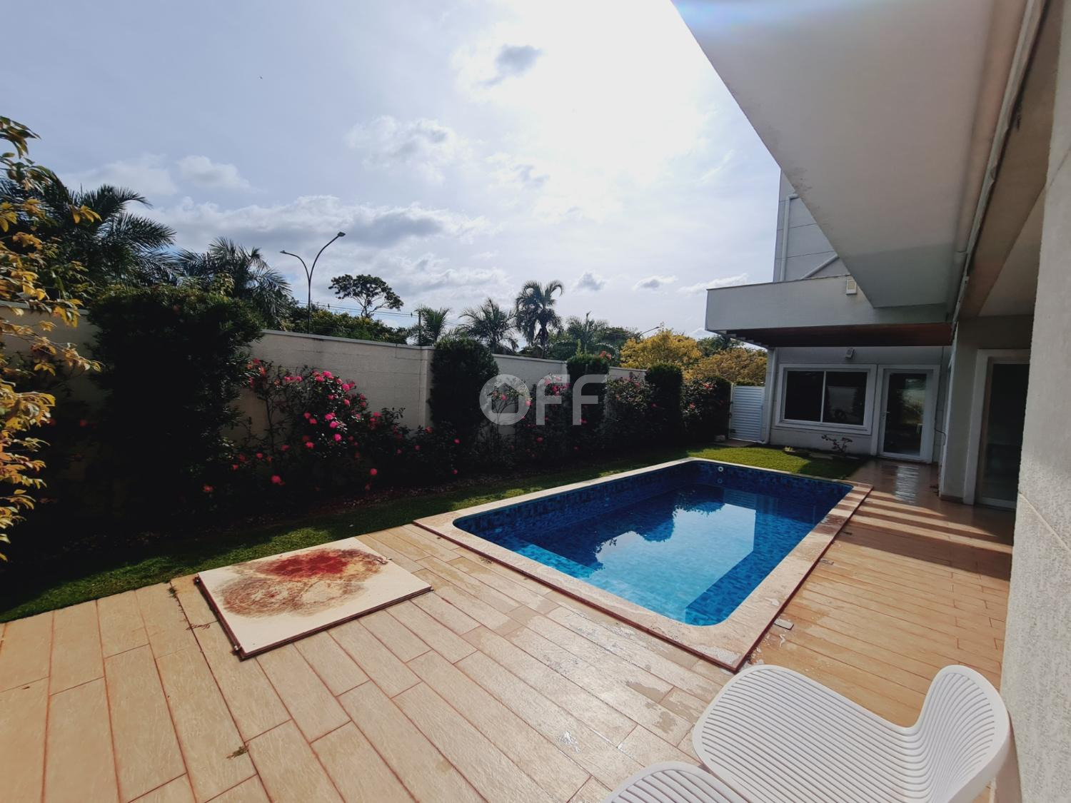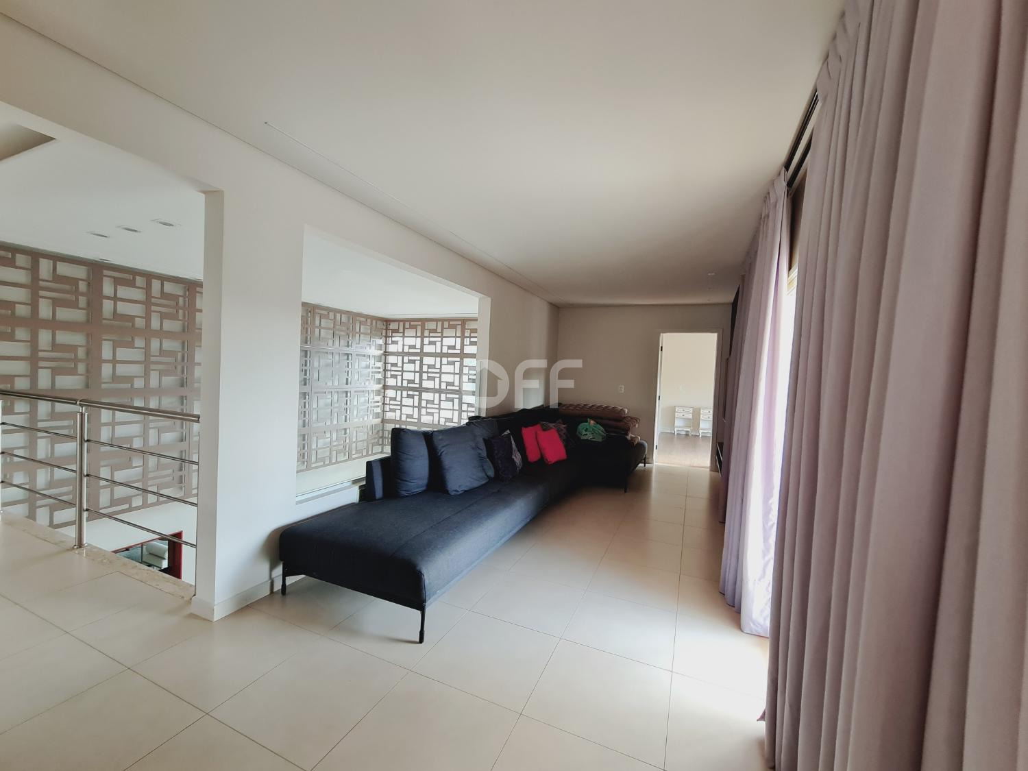A residência conta com isolamento lateral, com ambientes amplos e integrados, como sala de estar, sala de jantar, sala de cinema com varanda com vista para a piscina.