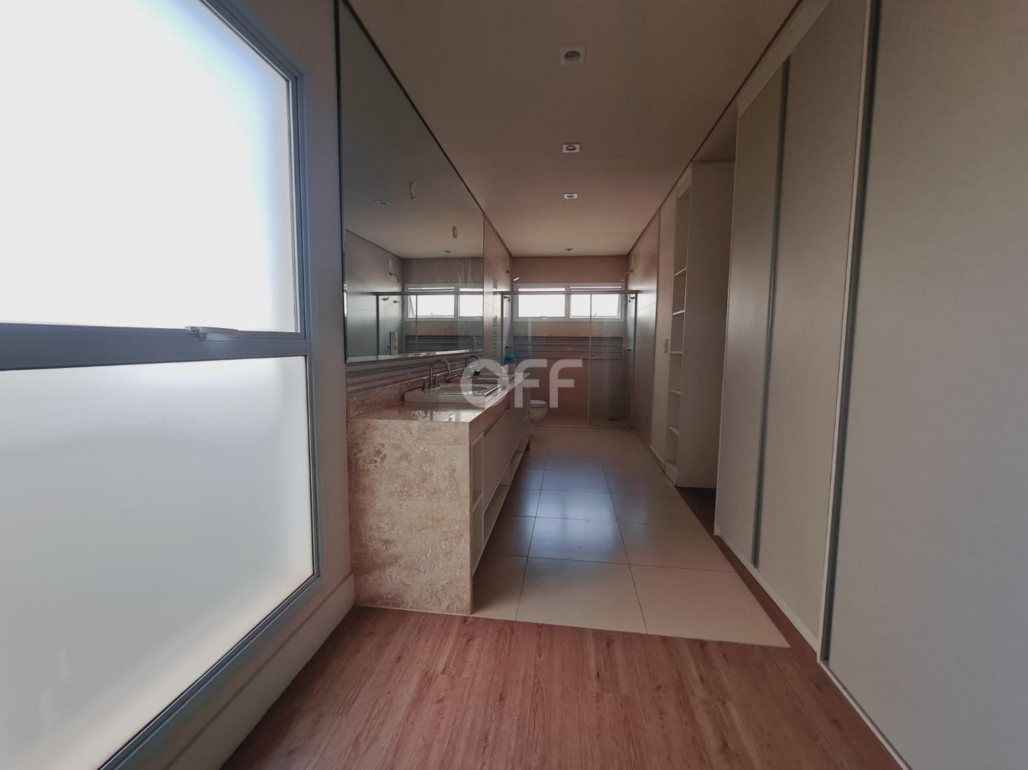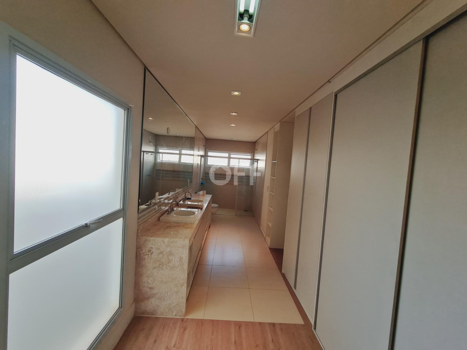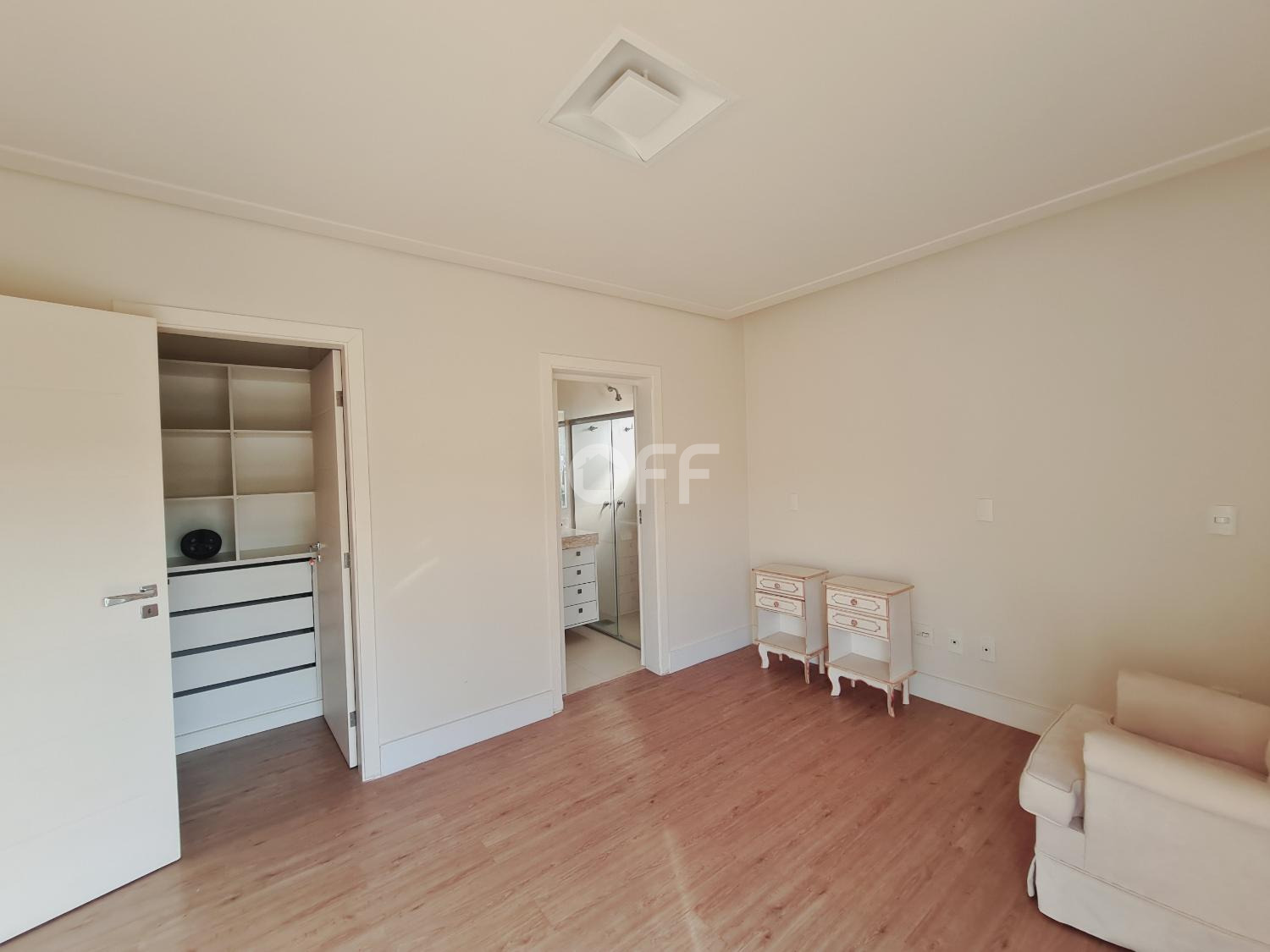 Pavimento superior São 3 suítes com closet, incluindo a suíte máster com dois closets espaçosos, e no pavimento térreo, ideal para quem busca acessibilidade e privacidade para hóspedes.